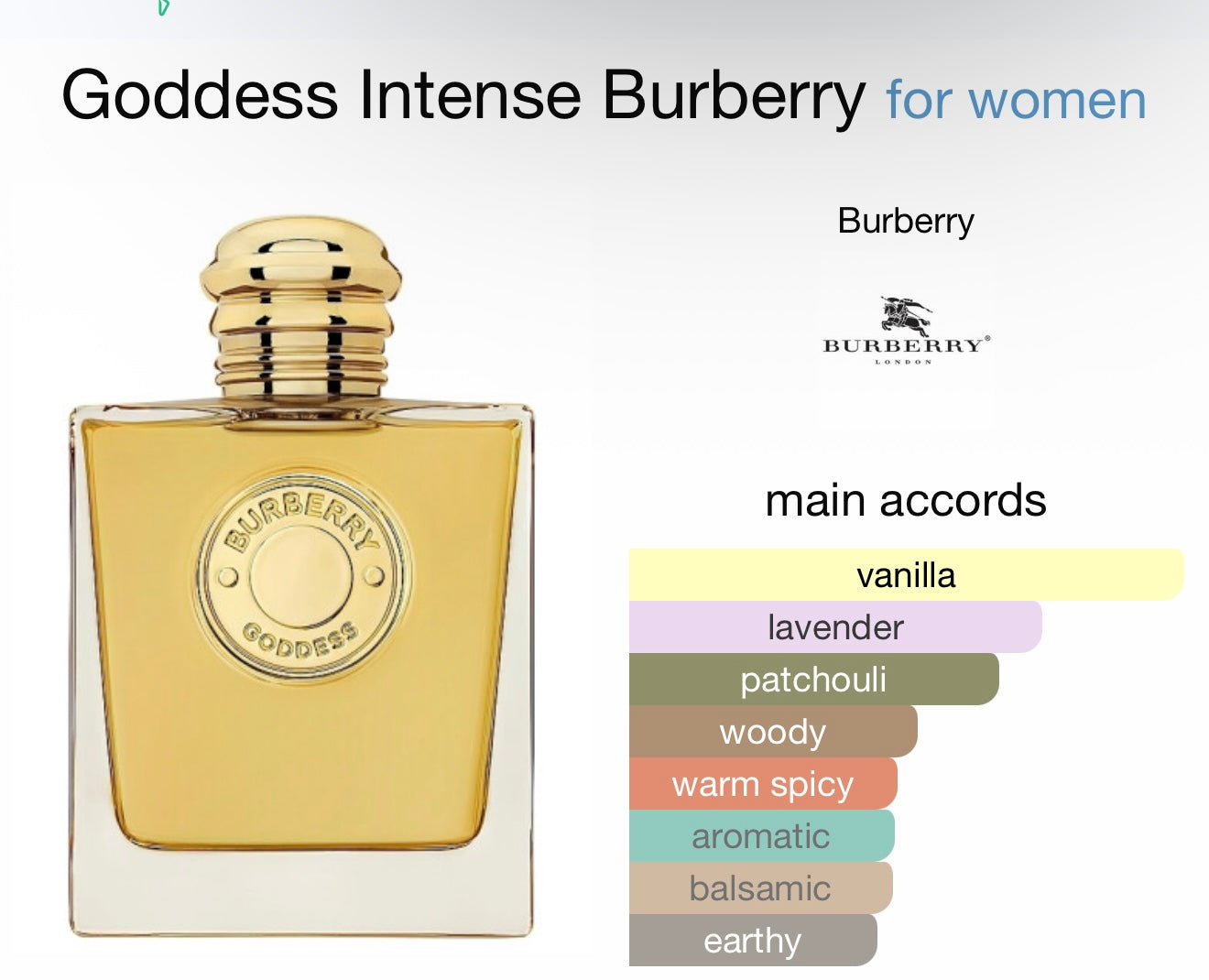 يقدم عطر Goddess Intense تجربة أعمق وأكثر حسية مع دفء وتعقيد متزايدين من خلال طبقات الفانيليا المكثفة وحبوب التونكا، مما يجعله مثاليًا للارتداء في المساء أو المواسم الباردة.