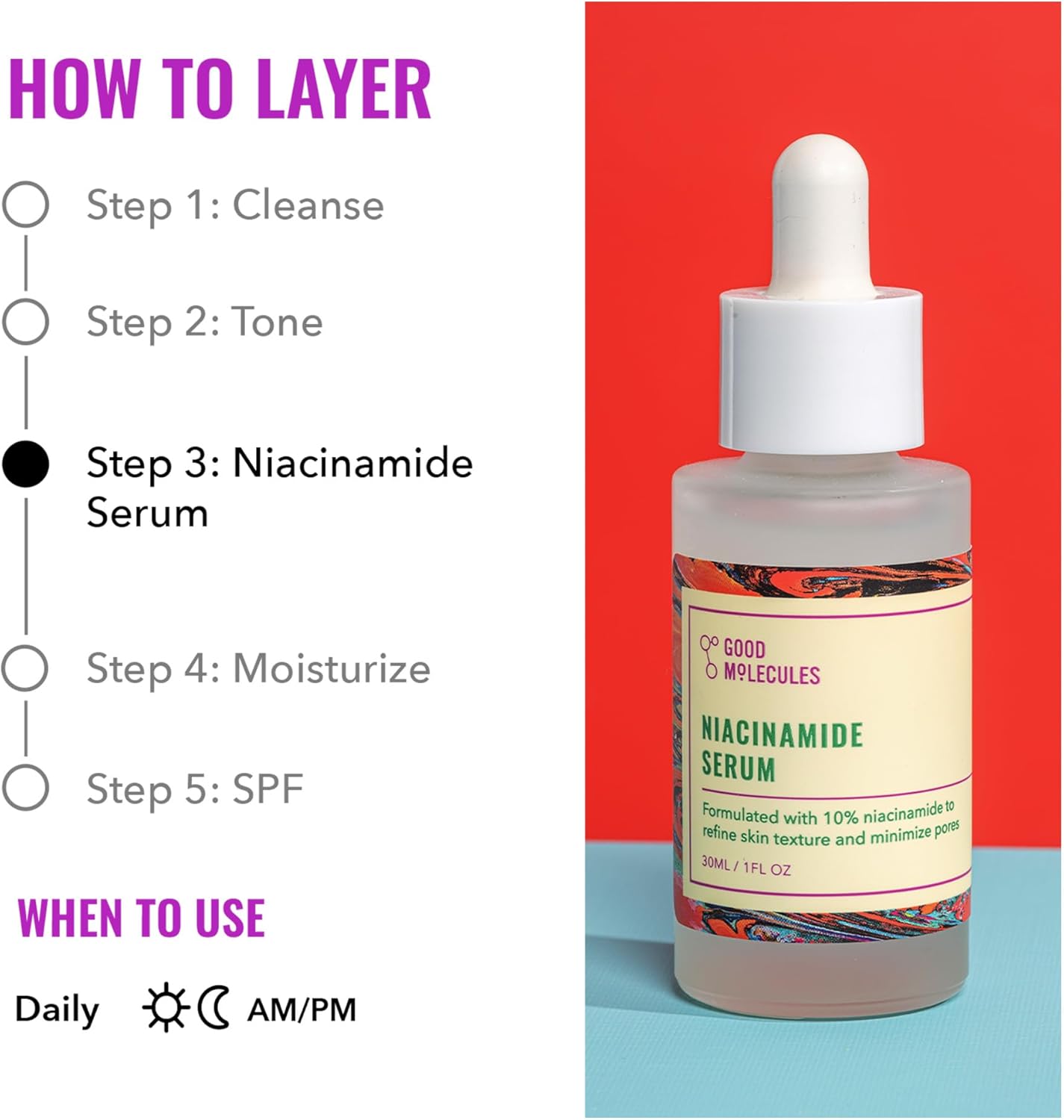 سيروم النياسيناميد من جود موليكلز: خفيف الوزن، ذو أساس مائي. 10% من النياسيناميد يُحسّن لون البشرة وملمسها، ويُقلل المسام، ويُوازن الزيوت. لطيف على جميع أنواع البشرة.