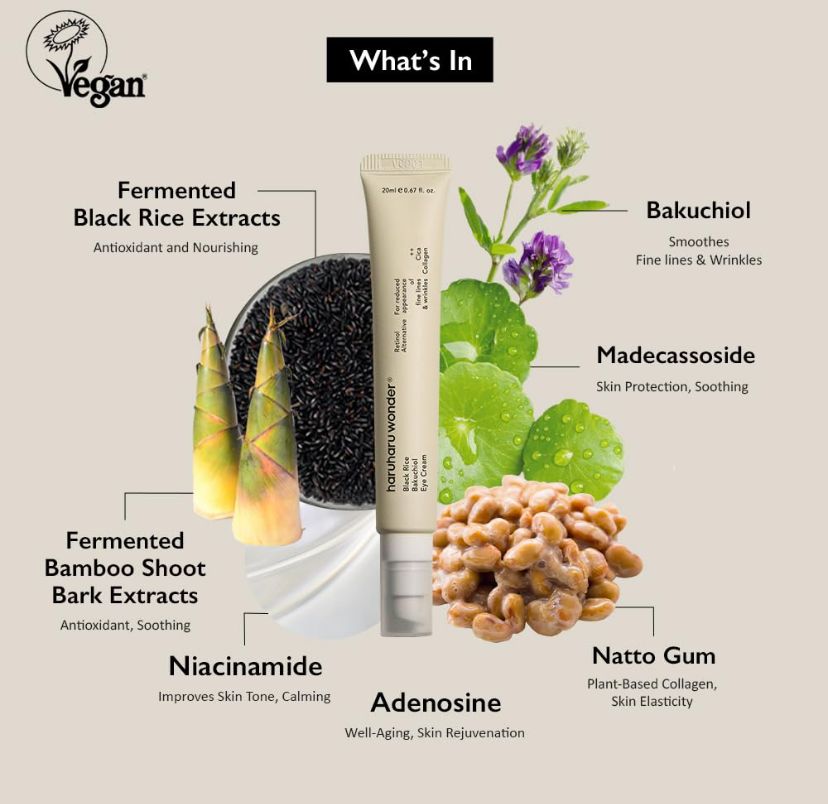 • مستخلص الأرز الأسود المخمر (2000 جزء في المليون): غني بمضادات الأكسدة لتغذية البشرة وحمايتها.