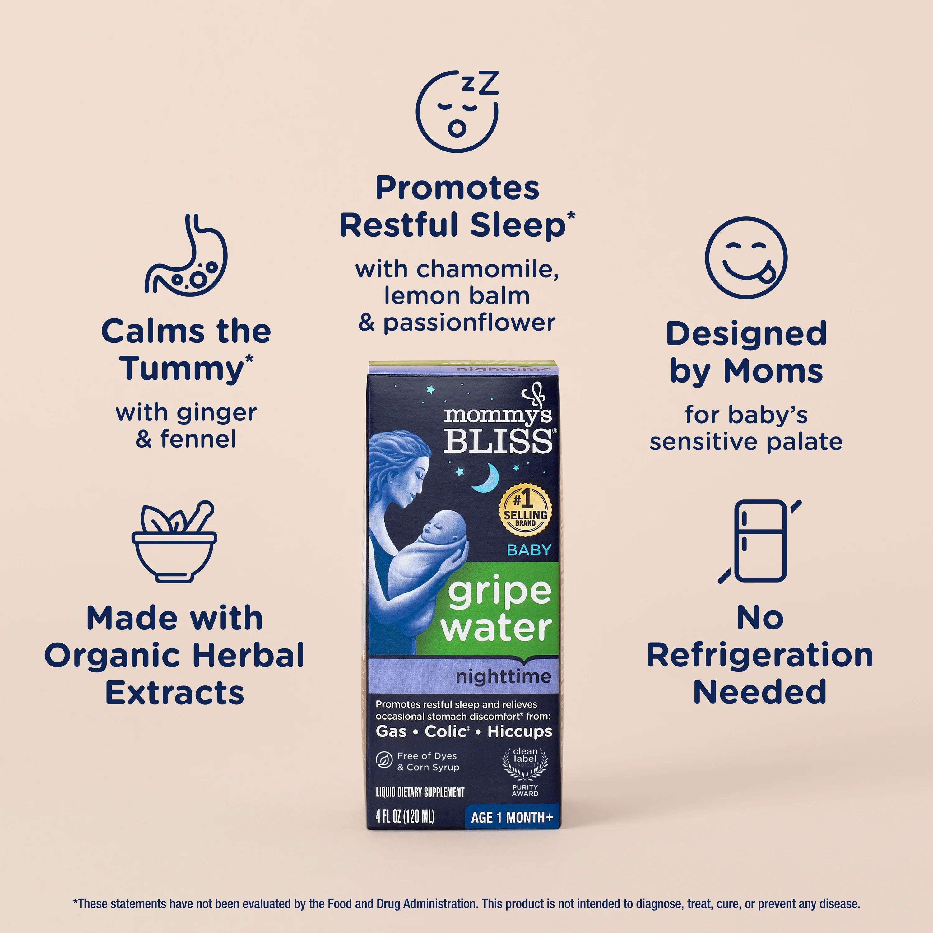 Mommy’s Bliss Gripe Water Night Time is a gentle, herbal supplement crafted to help soothe occasional stomach discomfort in babies so they can settle in for a more restful night. Made with time-trusted ingredients like chamomile, lemon balm, and ginger, this night-time formula helps calm fussiness associated with gas, colic, hiccups, or general discomfort. Non-habit forming and free from artificial additives, it’s a comforting choice for parents who want a natural nighttime routine.