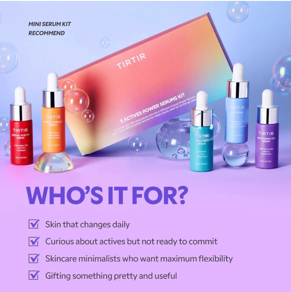 The TIRTIR 5 Actives Power Serum Kit is a targeted serum collection designed to address multiple skin concerns with potent active ingredients in convenient 10 ml formats. Whether you’re tackling dullness, uneven texture, enlarged pores, oil imbalance, or redness, this kit lets you customize your skincare routine daily. With five specialized serums formulated with clinically tested actives such as Niacinamide, Vitamin C, Azelaic Acid, PHA, and botanical hydrators, this set delivers visible improvements in skin clarity, texture, hydration, and radiance. It’s the ideal starter kit for ingredient-focused skincare enthusiasts, travelers, or anyone seeking targeted solutions without committing to full-size bottles.