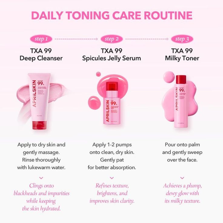 APRILSKIN’s TXA Niacinamide 99 Milky Toner is a high-performance brightening and hydrating toner designed to transform dull, uneven skin into a radiant, balanced complexion. This innovative Korean skincare product combines 99% high-purity Tranexamic Acid (TXA) with 5% Niacinamide to effectively target dark spots, hyperpigmentation, and uneven skin tone while deeply hydrating the skin. Its rich milky texture delivers nutrients and moisture without greasy residue, leaving skin smooth, supple, and glowing.