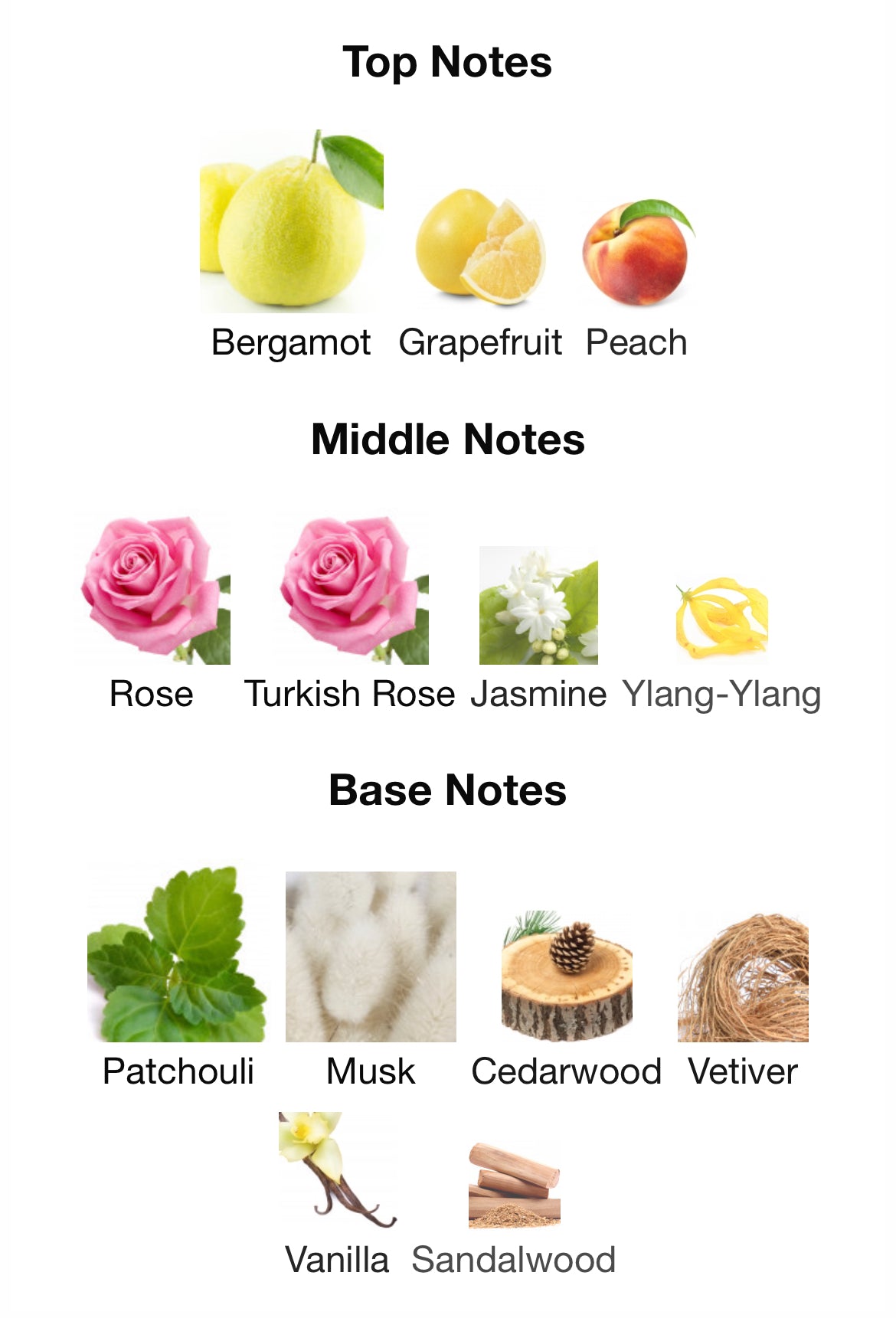 Heart Notes: Rose, Turkish Rose, Jasmine, Ylang-Ylang (The rich, feminine heart).
