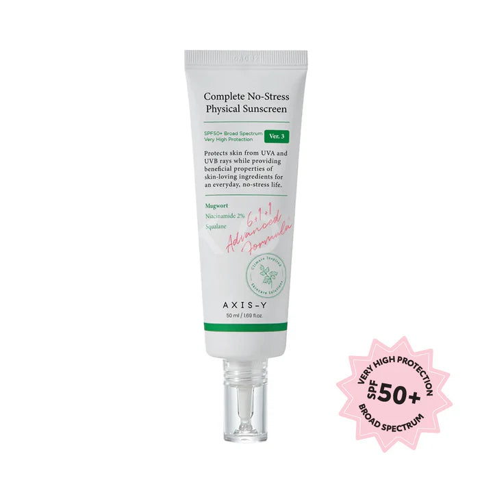 Introducing the latest iteration of the Complete No-Stress Physical Sunscreen (v.3) from AXIS-Y, crafted by skincare experts for targeted results. This gentle sunscreen, boasting a 100% mineral-based formula with SPF50+, is formulated to both soothe and shield the skin.