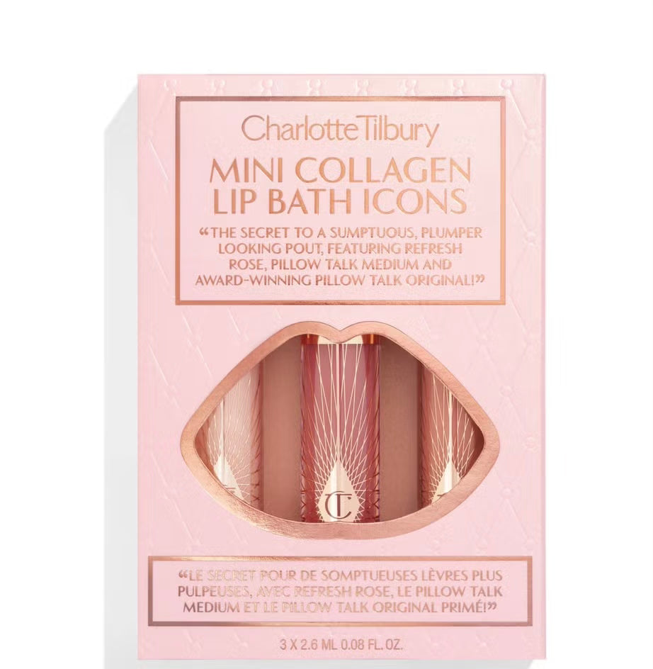 Discover the ultimate on-the-go lip essential with the charlotte tilbury collagen lip bath. This deluxe mini set is infused with hydrating Portulaca Pilosa ("kiss-me-quick") extract and plumping mustard sprout peptides. It delivers a high-shine finish for irresistibly glossy, fuller-looking lips. The trio includes three versatile shades—nude-pink, clear "Refresh Rose," and berry-pink "Pillow Talk Medium"—making it perfect for any mood or occasion.