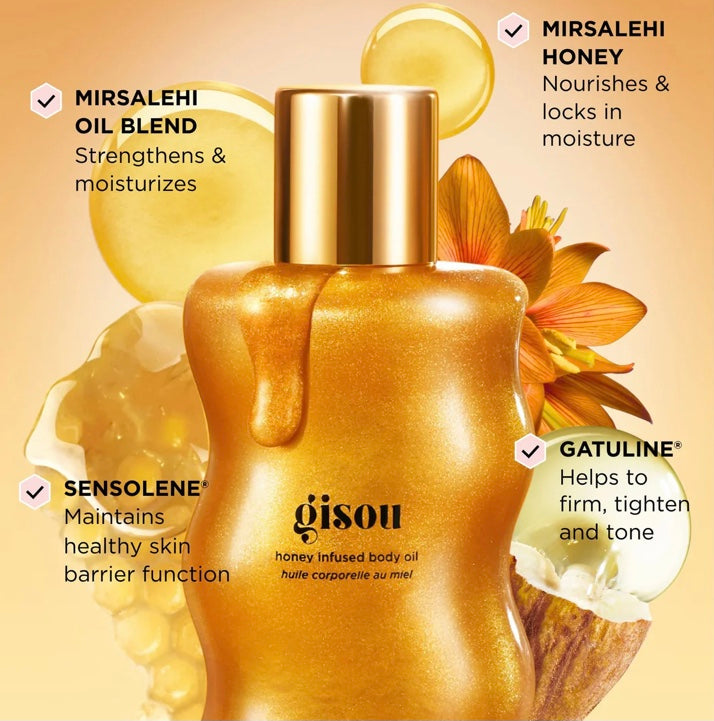 gisou body oil shimmer is a luxurious glow body oil with 98% natural ingredients, Mirsalehi Honey, and a proprietary Bee Garden Oil Blend. This lightweight, fast-absorbing formula provides deep hydration, supports skin elasticity, and delivers a pearlescent honey gold radiance. Encased in an ergonomic, sculptural bottle, it's an elegant addition to any beauty cabinet.