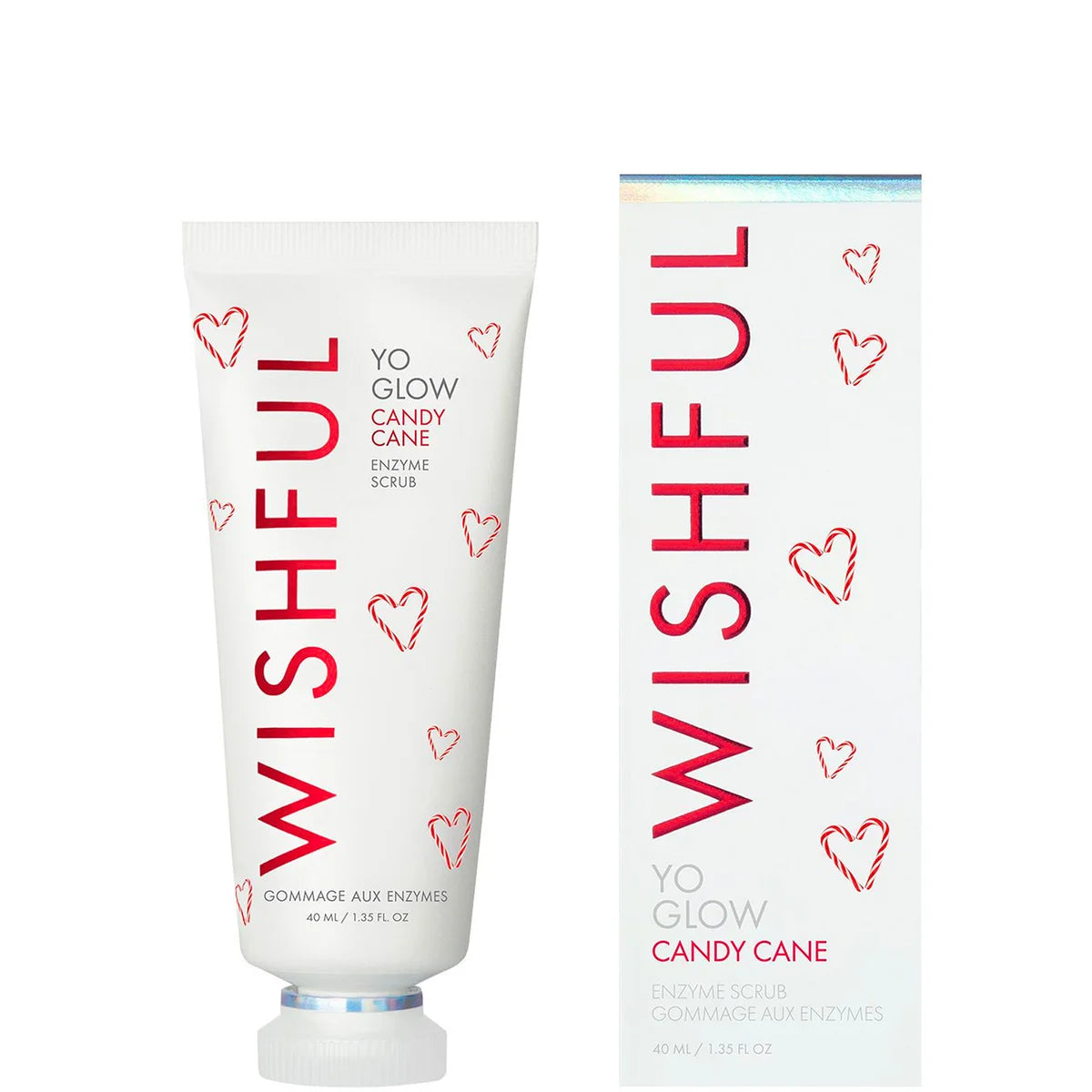 Yo Glow Candy Cane is a festive twist on the popular enzyme scrub from Wishful. Infused with fruit enzymes and chemical exfoliants, this scrub targets dullness, dark spots, and uneven texture while adding a playful candy-cane scent. Papaya (papain) and pineapple (bromelain) extracts combine with AHA/BHA acids to help slough away dead skin cells and reveal a smoother, brighter complexion.