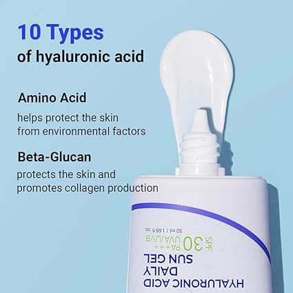 Isntree Hyaluronic Sun Gel Lightweight SPF30 PA+++ chemical sunscreen with 10 HA types for deep hydration. Absorbs fast, no white cast. Soothes & brightens
