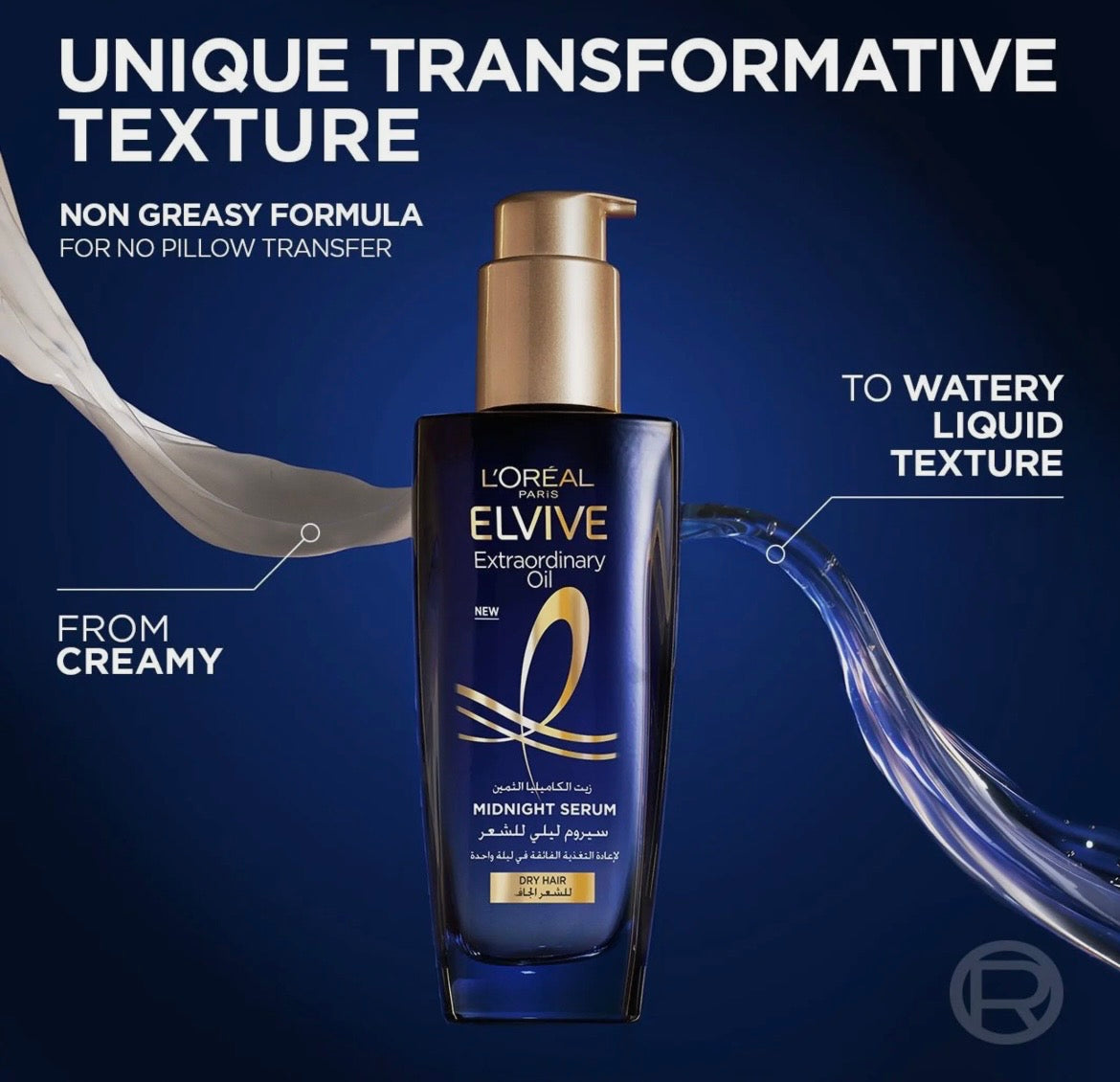 L’Oréal Elvive Extraordinary Oil Nourishing Midnight Serum is an overnight hair treatment designed to nourish, smooth, and revitalize dry and dull hair while you sleep. Created by L'Oréal, this lightweight serum is formulated to absorb quickly into the hair fiber without leaving residue on pillows or weighing hair down.