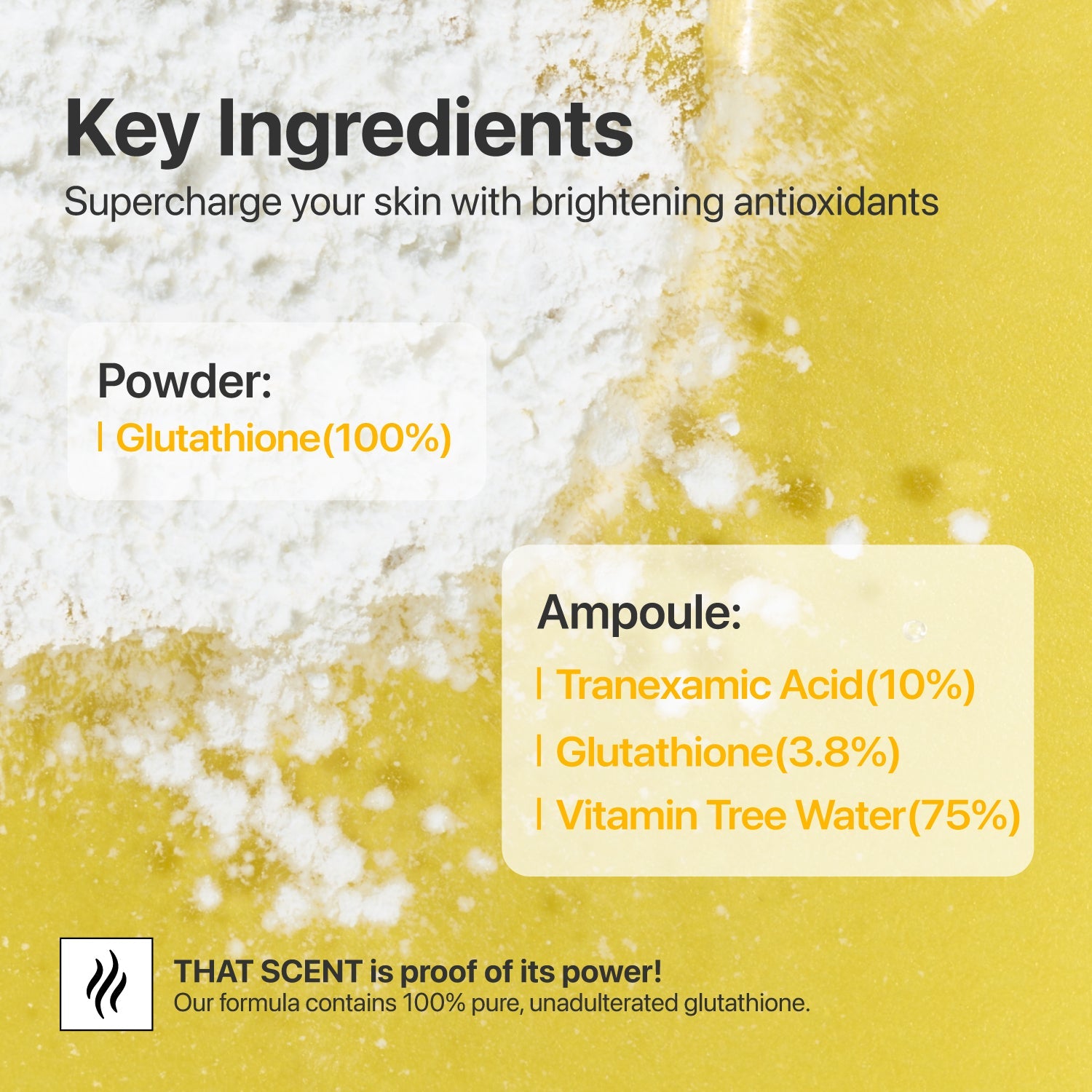 Brightens and evens skin tone with glutathione and tranexamic acid