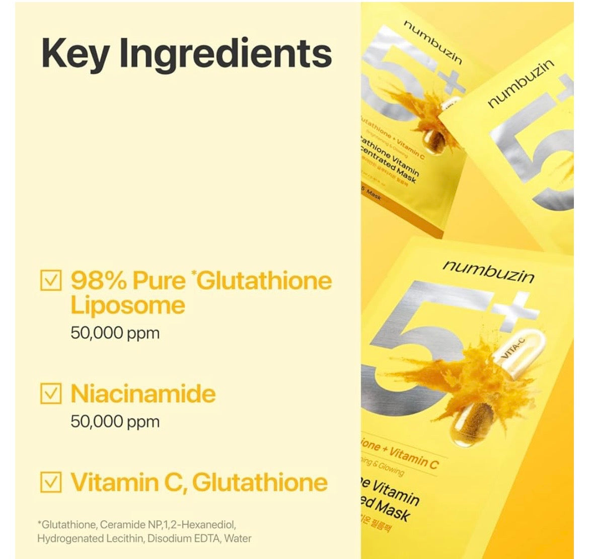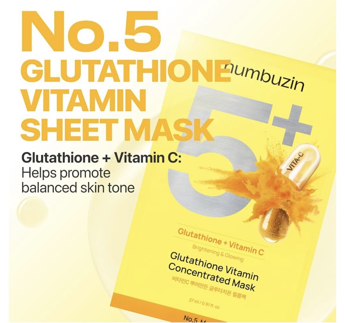 Illuminate dull, uneven skin with NUMBUZIN No.5 Glutathione Vitamin Concentrated Mask — a high-performance brightening sheet mask formulated to enhance radiance and promote a more even-looking complexion. Infused with glutathione and a vitamin complex, this concentrated essence works to revitalize tired skin while delivering deep hydration.