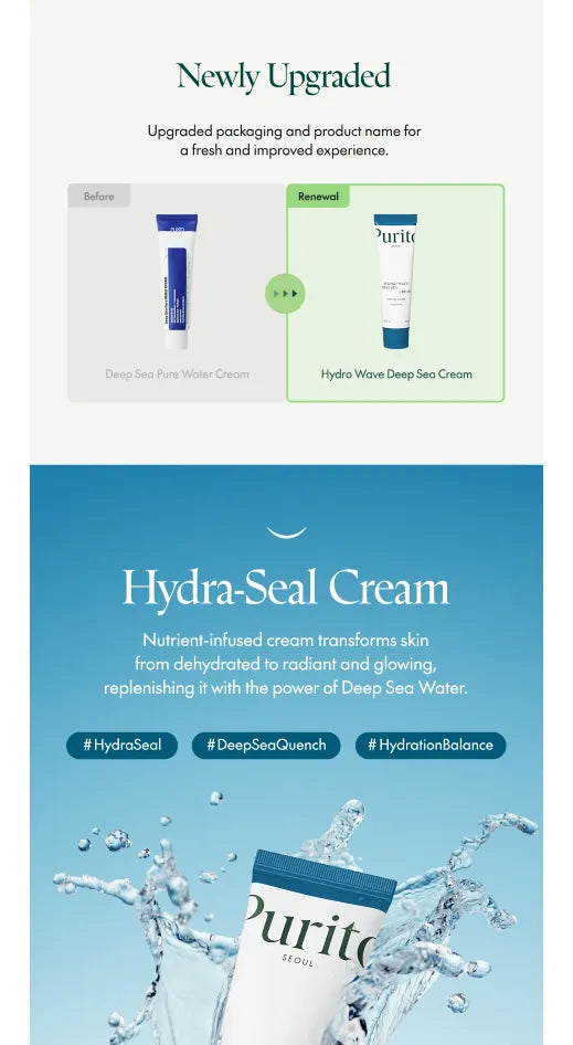 Unlock intense, long-lasting hydration with Purito Seoul Hydro Wave Deep Sea Cream — a lightweight gel cream powered by mineral-rich Gangwondo deep sea water, marine complex, and sodium hyaluronate to drench skin in moisture, balance oil-water levels, and leave skin with a supple, dewy glow. Perfect for dry, sensitive, or combination skin that needs nourishment without greasiness.