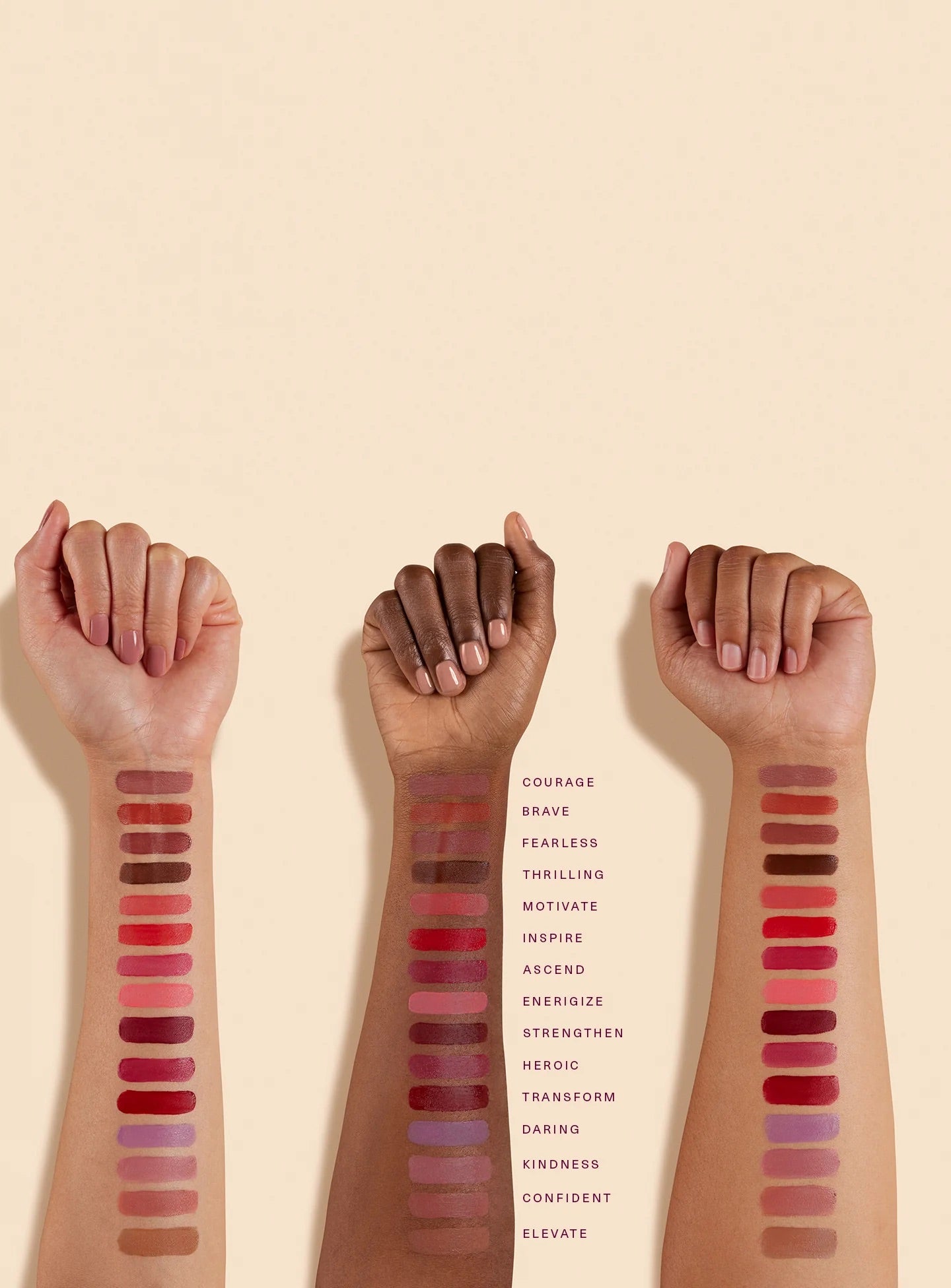 Rare Beauty's Lip Soufflé delivers full, air-whipped pigment with a velvety matte finish. This lightweight, cream-to-matte lip color envelops lips in rich, nourishing hydration, preventing caking or dryness. Infused with a botanical blend of lotus, gardenia, white water lily, and Vitamin E, it softens and smooths while creating a soft-blurring effect for plumper-looking lips.