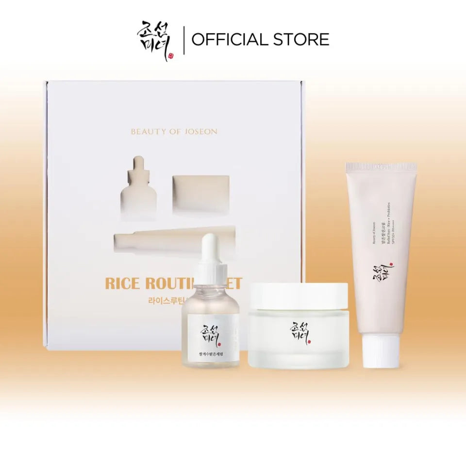 Transform your skincare routine with Beauty of Joseon Rice Routine Kit. Includes Rice + Probiotics SPF50+, Dynasty Cream, and Glow Deep Serum for hydration and brightening.