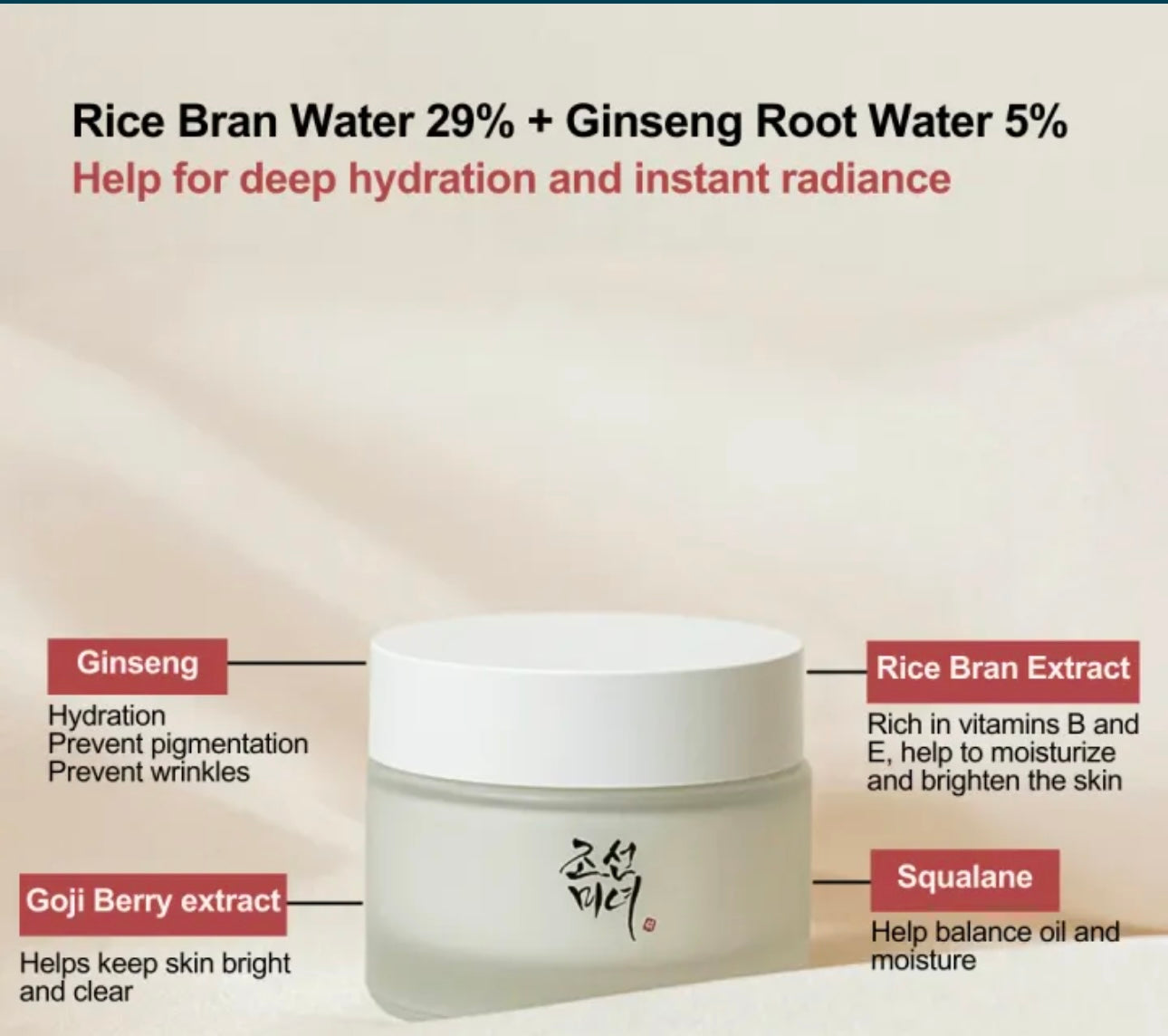 Beauty of Joseon Dynasty Cream (50ml): A rich, deeply moisturizing cream featuring rice bran water, ginseng, niacinamide, and squalane that provides long-lasting hydration and improves skin elasticity.