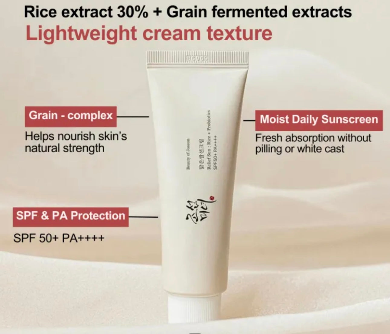 Beauty of Joseon Relief Sun: Rice + Probiotics SPF50+ PA++++ (50ml): A lightweight sunscreen enriched with rice extract and probiotics that protect, nourish, and soothe the skin without leaving a white cast.