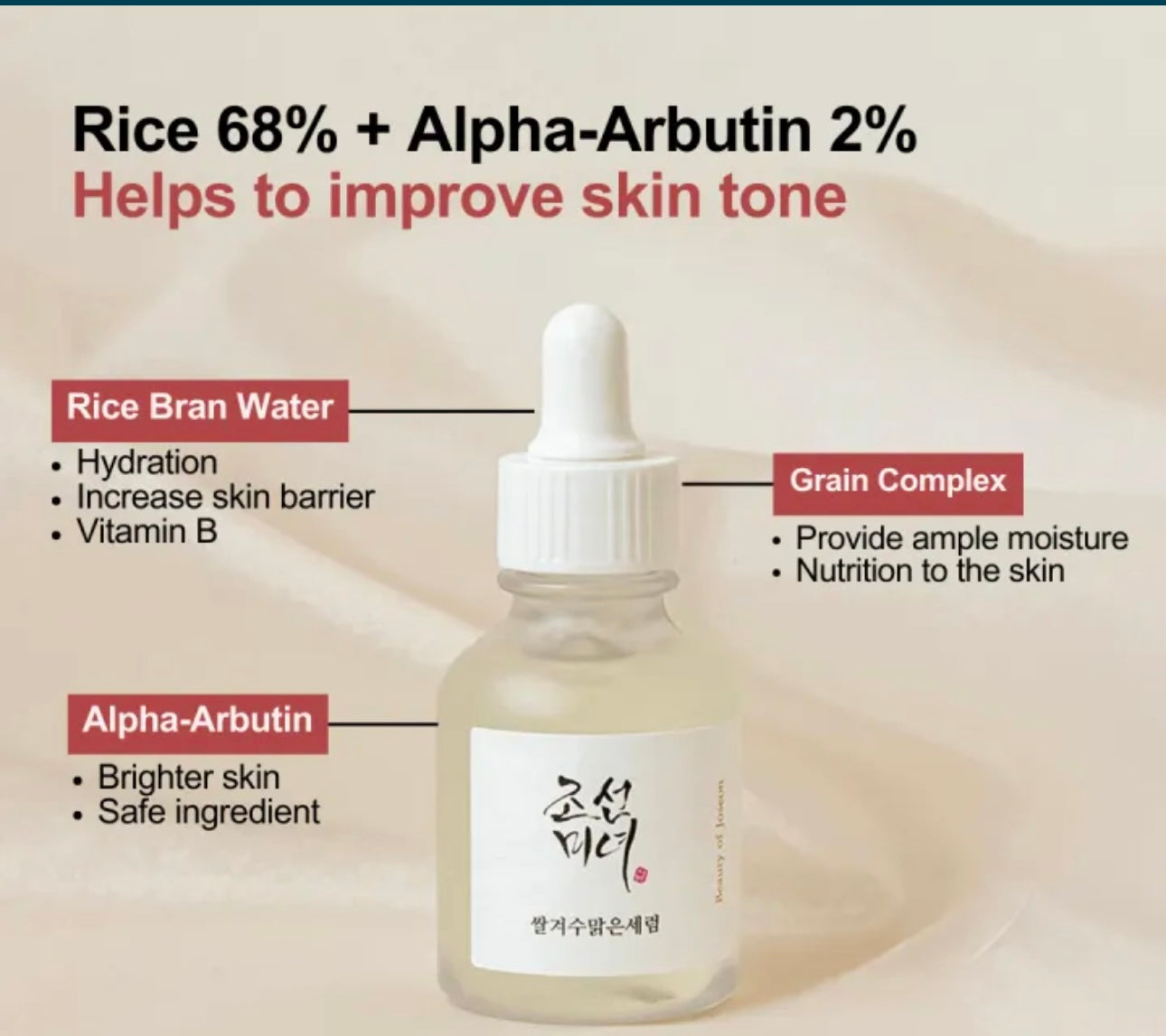 Beauty of Joseon Glow Deep Serum: Rice + Alpha Arbutin (30ml): A brightening and hydrating serum containing rice bran water and 2% alpha arbutin that fades dark spots, evens out skin tone, and promotes a radiant complexion.