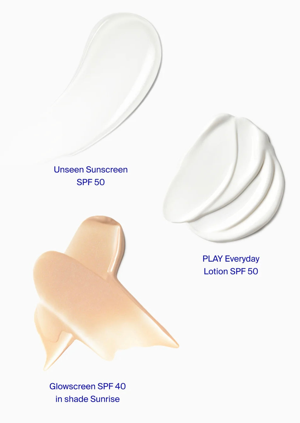 A: Yes! Unseen is non-comedogenic and ideal for acne-prone or sensitive skin, Glowscreen adds hydration for all skin types, and PLAY is light and nourishing for the face and body.